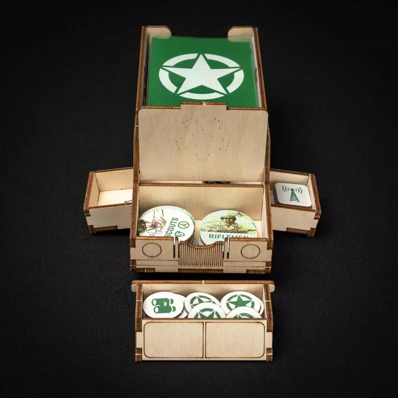 The key to a successful attack is orderliness and this is what you can achieve by adding our organizer to your gamebox. Build the scenario easily by pulling out map tiles from their holder, keep the objective markers at hand in their designated tray, grab your army truck with your troop ready and start combat.