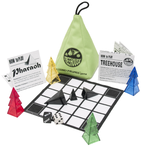 Treehouse is a simple-yet-challenging Icehouse game that comes with 15 Icehouse pyramids, with three pyramids each in five different colors. A special D6 gives each player the option to Aim, Hop, Tip, Swap or Dig each turn, with the player trying to rearrange his initial “tree” of pyramids to match the three in the “House”, which serves as the goal for all players.