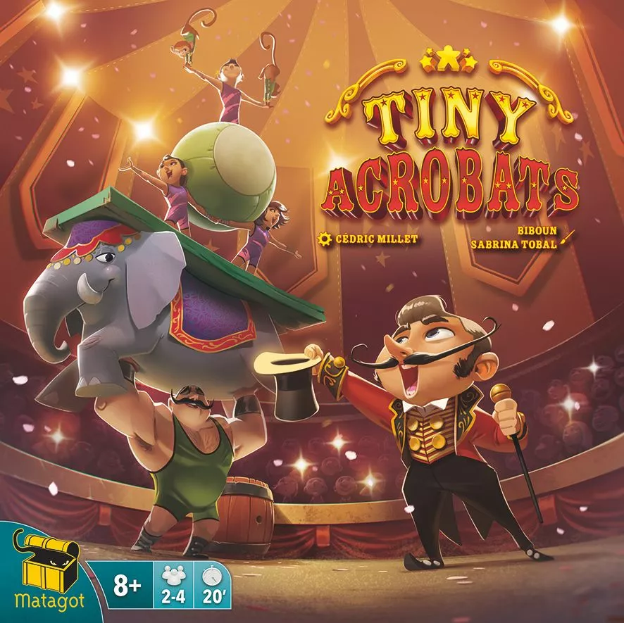 In Tiny Acrobats, which combines the excitement and thrills of Meeple Circus with new rules and streamlined scoring, you have three rounds to create your show and perform numbers that will meet the public demands, which change at the end of each round. During each round, you select the meeples that you want to add to your troop, then assemble them on stage. Players have a limited time to achieve their prowess simultaneously. Practicing your dexterity, use your meeples to collect applause and earn points. You have to reproduce the figures requested by the public, stage the special arrangements of your guest stars, and raise your troop high in the air because it will bring as much applause as its height. The player with the most applause after three rounds wins.