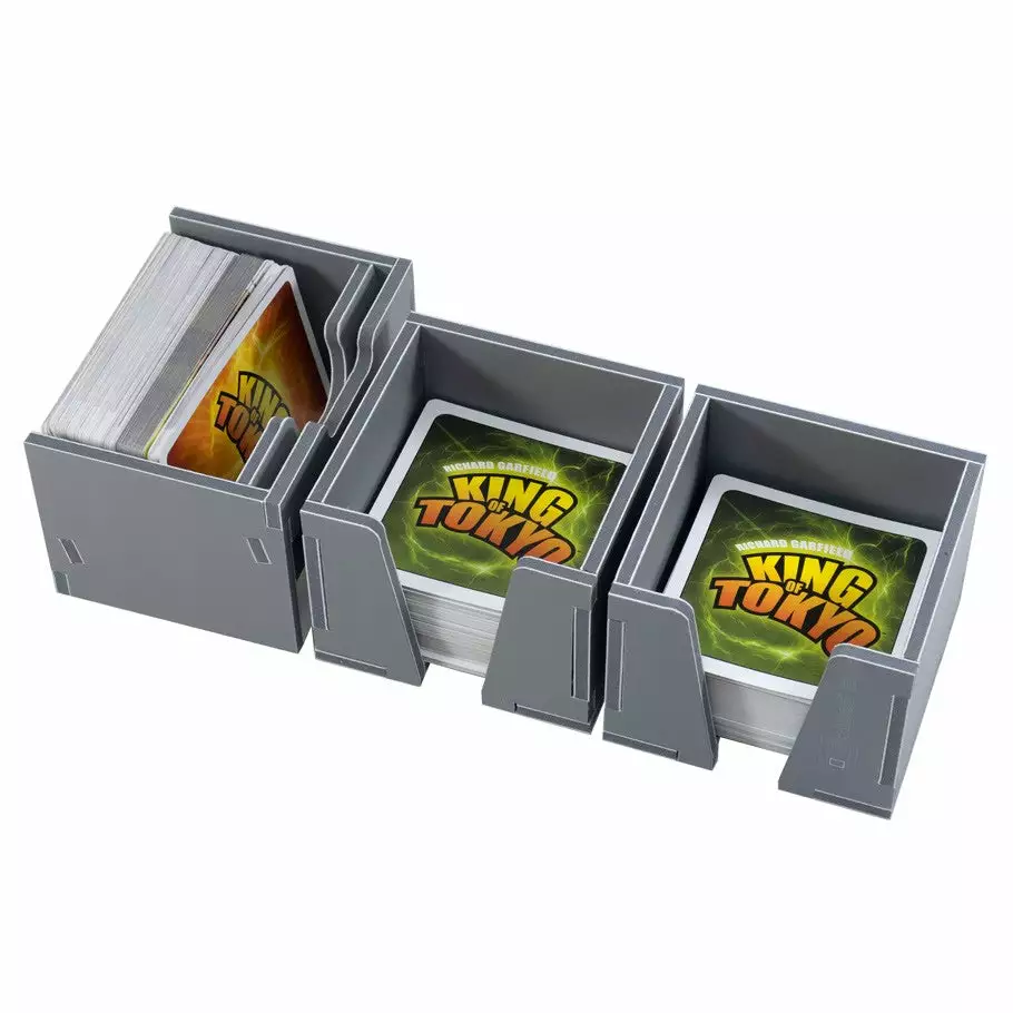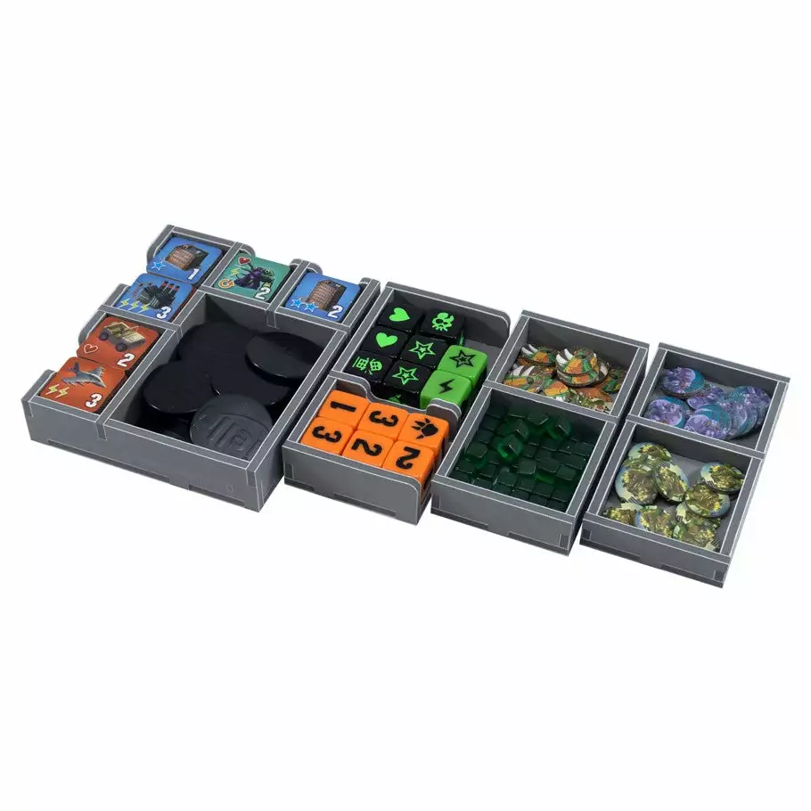 Insert compatible with King of Tokyo®, including the Power Up!® and Halloween® expansions, as well as the King Kong®, Cthulhu®, Anubis®, and Cybertooth® Monster Packs®. The design provides both efficient storage and improved game play. Many of the trays can be utilized during the game, and they greatly aid set-up and clear-away times.