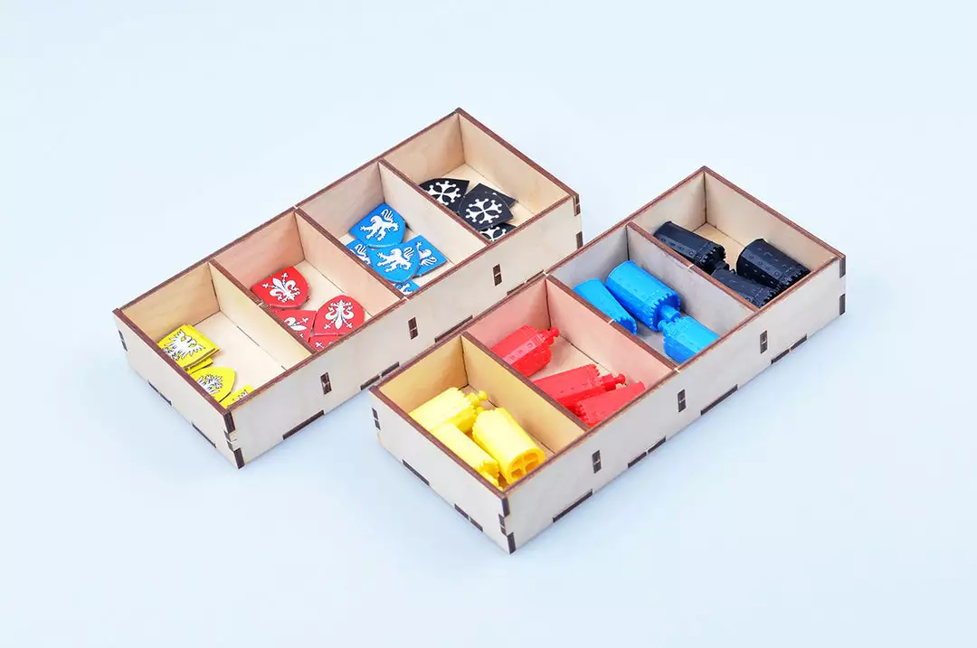 - Customized trays to hold player pieces for trading posts and strongholds.