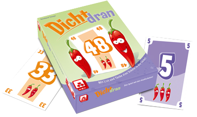In Dicht dran, there are cards from 1-100. Each players has 8 cards. Each round there is a target card (e.g. 60) and a gap (e.g. 11-46). Everyone plays one card, face down, then cards are revealed. If you are the closest to the target card, you’ll earn positive points. If you are not the closest, but your number fits in the gap, you get rid of negative points. If you can’t do both, you have to draw new cards. The round ends as soon as one player has played his last card.