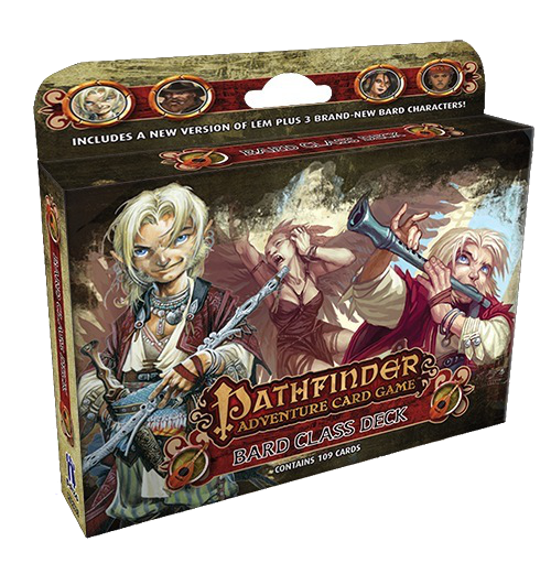 Bring your troubadour to any tavern with the Pathfinder Adventure Card Game Bard Deck . Explore four different bard characters in this 109-card set, from Lem the magic researcher to Siwar the information broker. The Bard Deck features diverse new allies, weapons, spells, and other loot to take your character all the way through any Pathfinder Adventure Card Game Base Set or Pathfinder Society Adventure Card Guild organized play campaign. Play on!