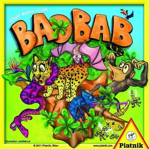 This dexterity game consists of a cardboard tree trunk and 110 cards. The cards are dealt to the players who then take turns placing them on the trunk. For each card type, there are different rules as to how to place the card: leopard cards have to be dropped onto the tree, branches and monkeys have to stick out from the other cards, snakes can be pushed underneath other cards, etc. All cards which fall down are taken by the active player. When a player has no more cards, everyone counts their remaining cards plus any taken ones. Whoever has least cards now is the winner.