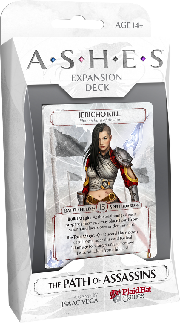 Born in bonds, Jericho Kill now sits on the throne of Abylon. Trained in combat from a young age, she brings her unique skills to the Ashes universe, allowing you to experiment with new strategies and paths to victory against other Phoenixborn. Take command of powerful allies or overwhelm your opponent with magic that refreshes your exhausted dice. Every card in The Path of Assassins can be used to customize any Ashes deck, giving you the freedom to tailor the experience to your own style of play. Unlock Jericho’s full potential with The Path of Assassins!