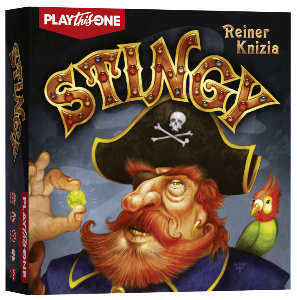 Stingy includes two-player rules that introduce a ghost pirate with whom players can trade, a variant in which players also score points for the number of differently colored groups they collect, and a “Captain Sly” variant in which an opponent who can’t take tiles worth at most what you took gets nothing. Good luck trying to make those unfair trades!