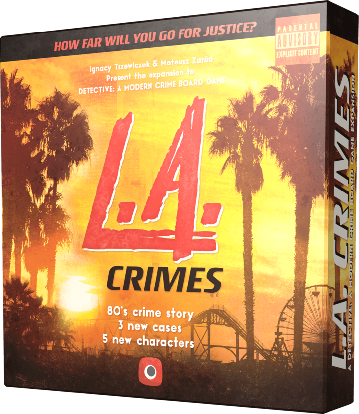 Detective: L.A. Crimes, the first campaign expansion for Detective: A Modern Crime Board Game, consists of three separate cases that come together to form a full story. Travel to sunny California, and delve deep into the drug-filled Los Angeles of the 1980s. Experience being an L.A. detective, and realize that sometimes, like detective Foley from Beverly Hills Cop, you may need to stretch the laws a bit to suit your needs. Try some controversial methods to solve your case, all the while battling with the red tape of bureaucracy. Use all-new mechanisms of stakeout and observation to learn more about your suspects. The choices are yours, but are you willing to cross the line?