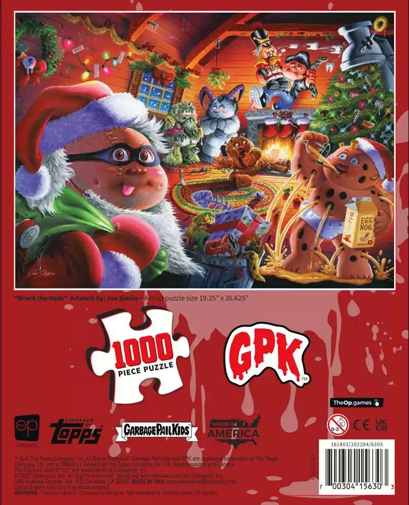 You better not cry over spilled nog or pout about the rest of the mess in this Garbage Pail Kids “Wreck the Halls” 1,000-piece jigsaw puzzle by artist Joe Simko, featuring Chris Mess peeping trashed presents and an unplugged Drippy Dan.