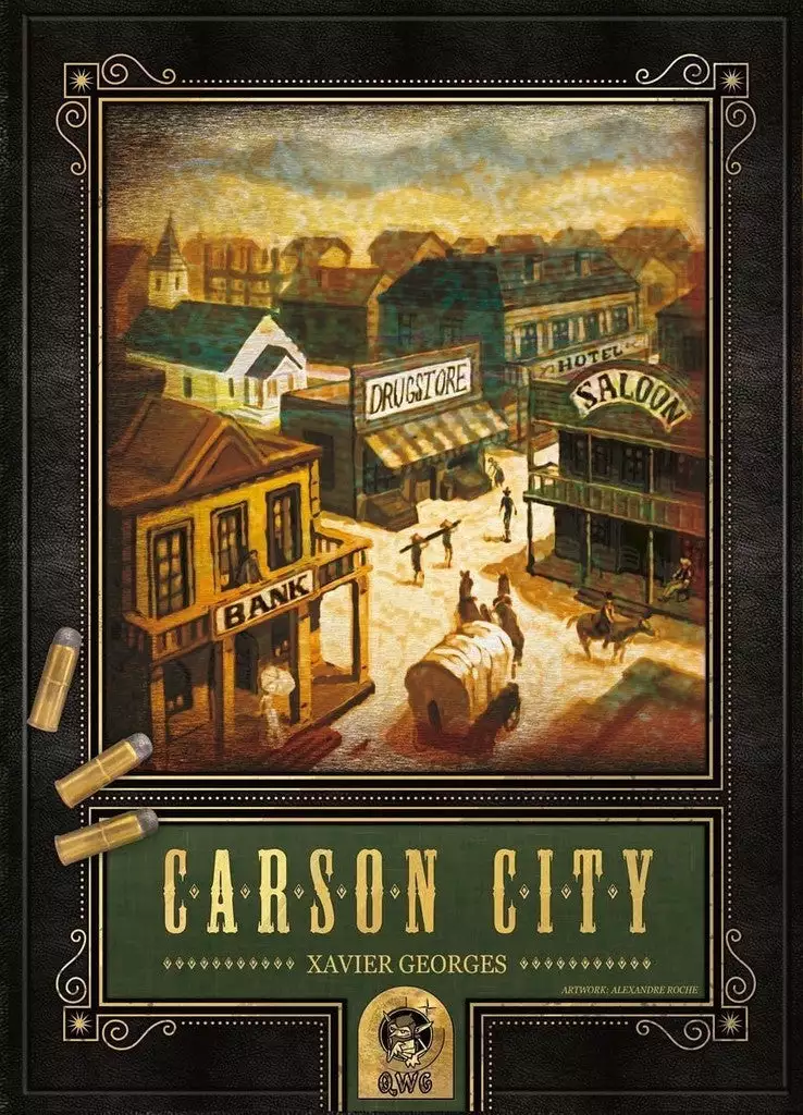 Carson City is a strategic game. The game is played in 4 rounds and in each one of them the players choose a character (there are 7 available) that gives certain advantages, after that cowboys are placed on action fields on the board to build Carson city. Players can claim ground, erect special buildings, houses or construct roads. When there are several players on 1 action field, a duel is fought. During play, money (to construct) & points can be earned. The player who earns most points wins the game.