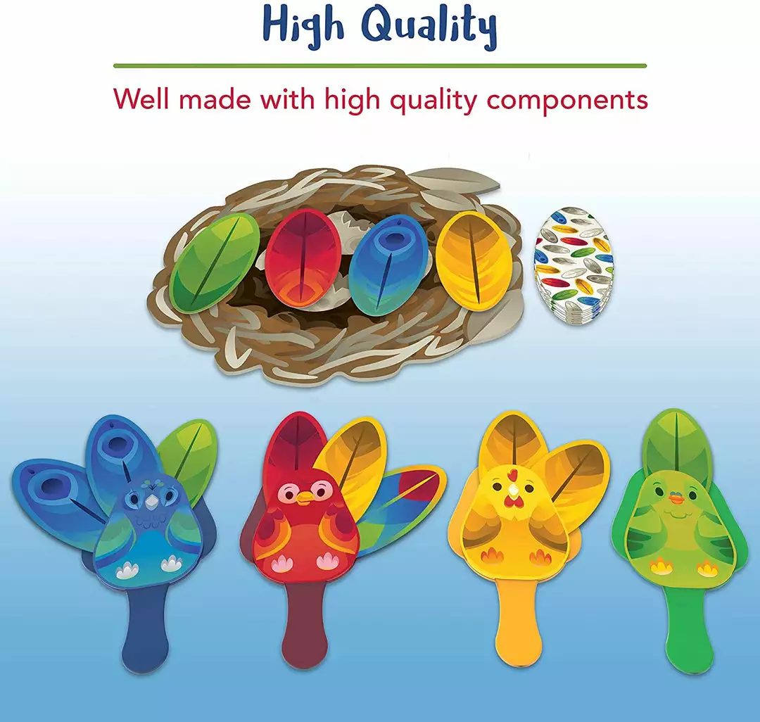 Four little birds are missing their tail feathers, and need your help to find them! Add feathers to your bird each turn by drawing from the deck, or trading away your unwanted feathers to the nest. Score points at the end of the game based on your colorful collection. The player with the most points wins!