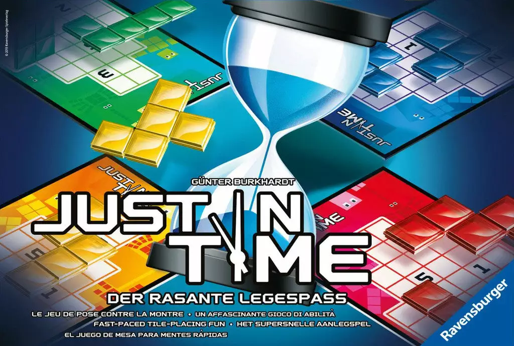 In Just in Time, each player tries to place his pieces on his game board faster than any other player, while leaving gaps in the right places on those boards. Ah, that’s the art of the game because there are many points waiting to be scored if the highest possible numbers survive in the gaps created with your playing pieces.