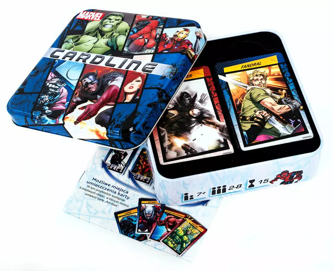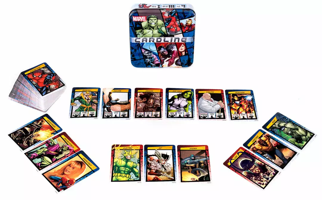 Cardline: Marvel is similar to Cardline: Animals — but with superheroes and other characters from the Marvel Comics universe! It is a card game played with approximately 100 cards. Both sides of each card depict a character and its name, while its weight, IQ and fighting ability are printed on only one side of the card. For each game, players decide before playing which of the three statistics they’re comparing.