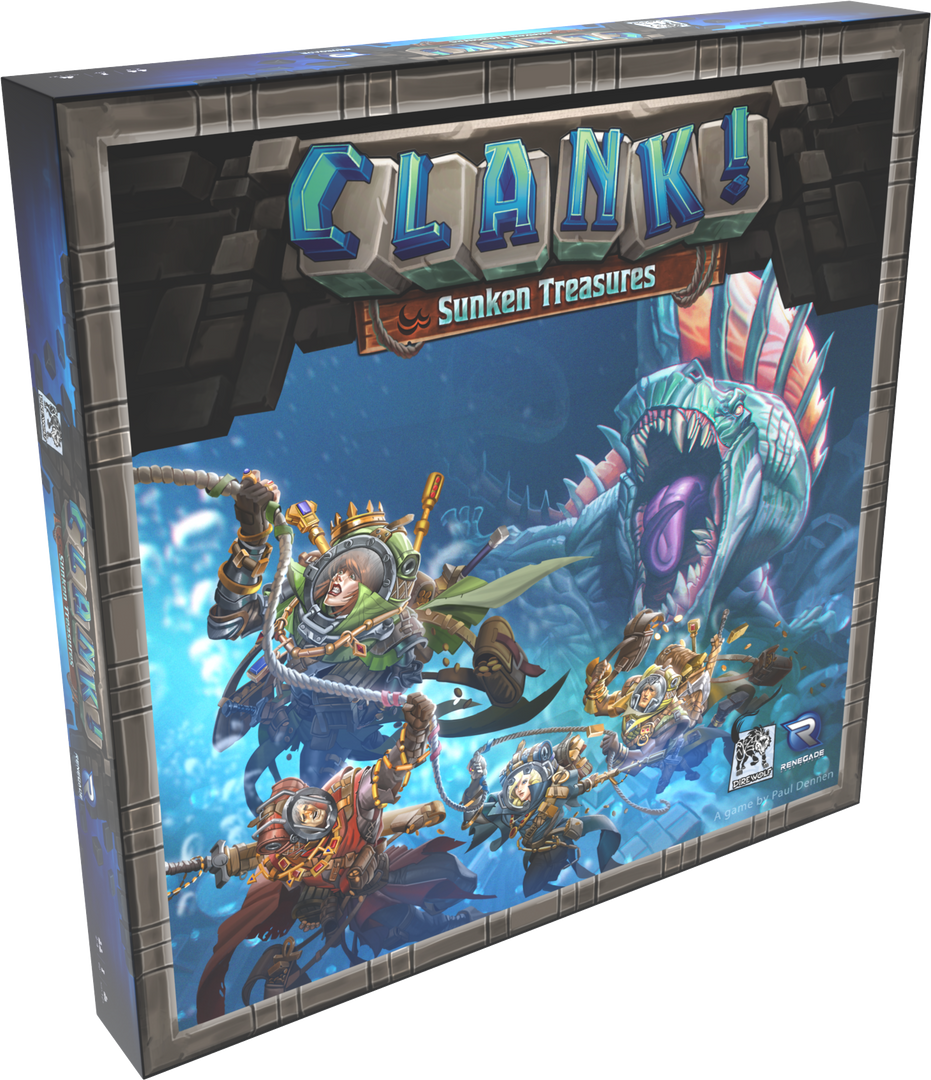 In Clank! Sunken Treasures, an expansion for Clank! A Deck-Building Adventure, players explore two partially flooded maps with new dungeon deck cards, a new persistent monster to defeat, new environmental challenges, and more as they venture in the watery depths!