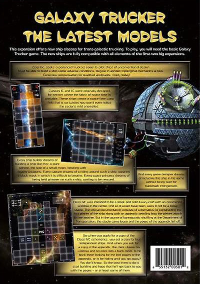 Galaxy Trucker: Latest Models consists of new game boards for 2-5 players with model C spaceships. Class 1C and 2C come on the same game board with color denoting spaces that can be used in 2C but not in 1C. Asteroids that approach the spaceship from the front or from behind sometimes swoop around to hit the ship on the side, and asteroids that approach from the side sometimes split in half and hit the ship twice! A structural rift down the center of the spaceship requires universal connectors to connect only with other universal connectors when bridging this rift. So much for their universality!