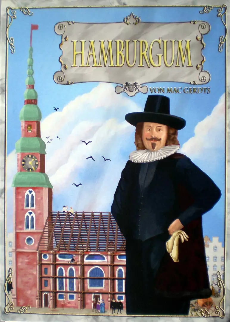 Hamburg in the 17th century! Mighty walls protect the city against the devastations of the Thirty Years War. Thanks to Protestant religious refugees, Hamburg has become the biggest and most prosperous city of Germany. From far away the skyline shows the steeples of huge churches and the masts of mighty trade ships displaying the citizensβ pride and prosperity.The players guide families of Hamburg in the pursuit of wealth and prestige. They produce beer, sugar and cloth and sell these goods with their ships overseas. They compete over the best sites for their buildings and the best berths for their ships in the harbour. But ultimately they vie for the most prestigious church donations, because neither gold nor goods, but only prestige decides the game. Hamburgum is a strategy game for 2 β 5 players without any luck of cards or dice. The actions are selected according to simple rules on a rondel. The reverse of the big double-sided game board offers another city, Londinium, a different strategic challenge.