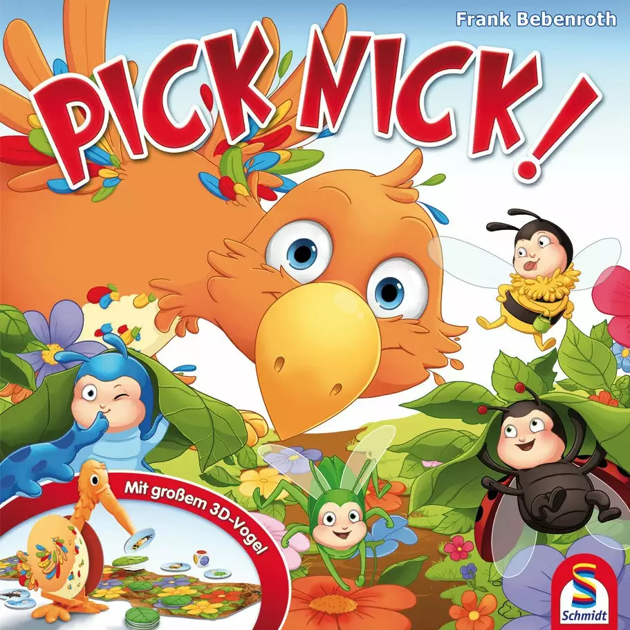 In Pick Nick, each player has two or three insects that they want to move out of the garden to safety. Nick the bird, however, has other plans and will peck at exposed insects to send them scurrying back to the starting line.