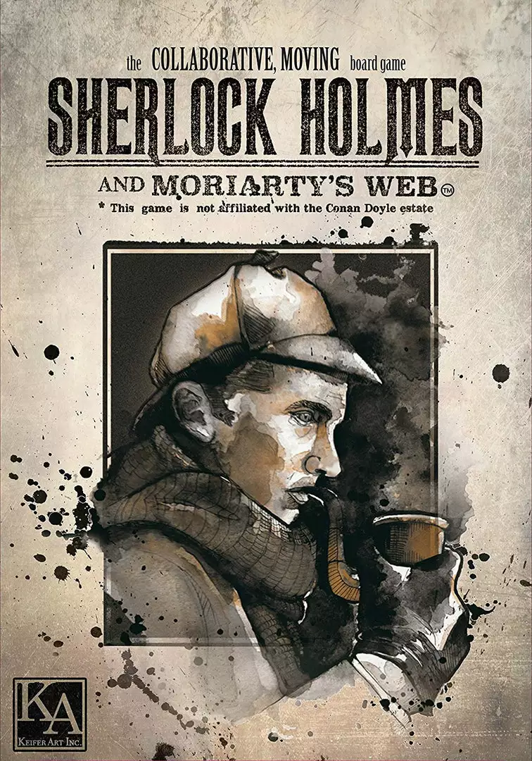 Sherlock Holmes and Moriarty’s Web is a cooperative crime-solving game played on a board of moving tiles. Play as Holmes and his confederates, building a case by placing informant, clue, and witness tiles in order to connect the unsolved crimes in London to the wicked Professor Moriarty – while he is doing all he can to destroy your case. Players all win (or lose) together.