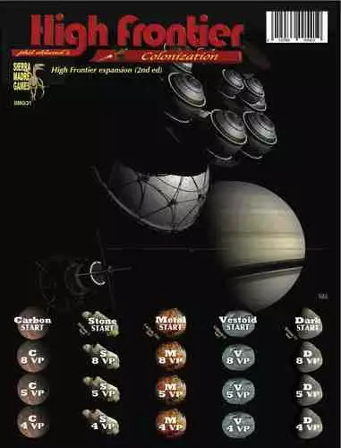 High Frontier Colonization, an expansion to both the first and second editions of High Frontier, includes all the elements of the first edition expansion (now out of print), but adds maps, cards, and playing pieces. The thriving space infrastructure has hundreds of specialists working in space colonies orbiting Earth. These provide services such as antimatter manufacture, beamed solar energy, cycler satellites, space telescopes, the space elevator, and of course the local tax office. New Bernal, Colonist, Freighter, and GW Thruster modules allow you to move your base of operations further afield in the High Frontier. The promoted side of the cards in the last two modules include new paths to victory called Futures.