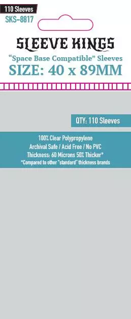 Note that Sleeve Kings sized these for 40×89 cards rather than 39×89 so they could also accommodate Coin & Crown, another popular game that is just 1 MM wider than Space Base cards, but both of these games’ cards will be well protected in these sleeves!