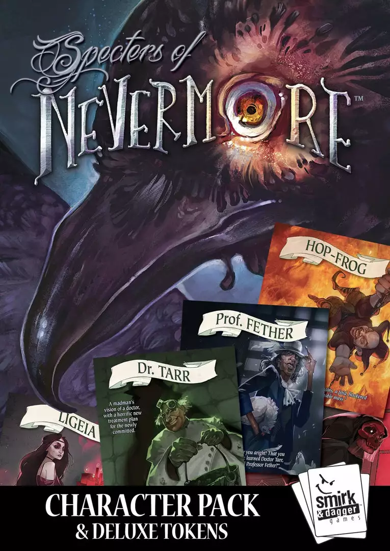 Specters of Nevermore, an expansion for the casual card-drafting game Nevermore, introduces twelve unique player characters based on the literary characters in Poe’s works: Dr. Tarr and Prof. Fether, The Imp of the Perverse, Dupin, Lenore and more. Each offers cool abilities for players, one for their human form and a second for their raven form, should they be turned into such. Characters are chosen in a draft, allowing players to select a character best suited to their play style.