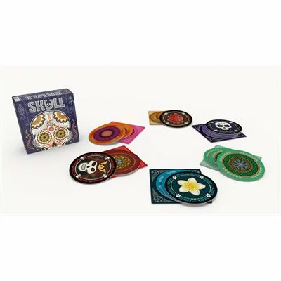 Skull & Roses is the quintessence of bluffing, a game in which everything is played in the players’ heads. Each player plays a face-down card, then each player in turn adds one more card – until someone feels safe enough to state that he can turn a number of cards face up and get only roses. Other players can then overbid him, saying they can turn even more cards face up. The highest bidder must then turn that number of cards face up, starting with his own. If he shows only roses, he wins; if he reveals a skull, he loses, placing one of his cards out of play. Two successful challenges wins the game. Skull & Roses is not a game of luck; it’s a game of poker face and meeting eyes.