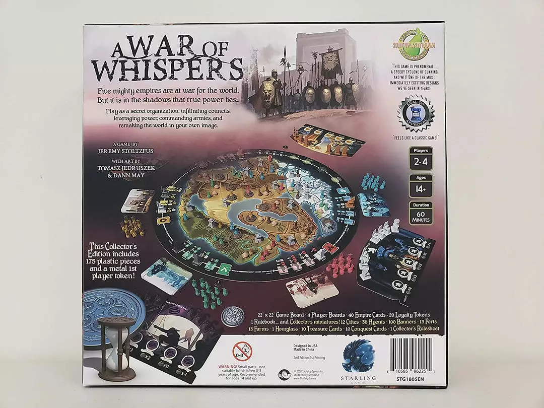 A War of Whispers is a competitive board game for 2 to 4 players. Five mighty empires are at war for the world, but you are no mighty ruler. Instead, you play a secret society that is betting on the results of this war while pulling strings to rig the results and ensure their bets pay off. A War of Whispers is a game of deep strategy, hidden agendas, and shifting loyalties.