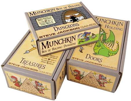 Munchkin Boxes of Holding are designed to hold cards from any of the many Munchkin games as those cards are a non-standard size. Each box can hold 500 cards, with one box for Door cards and one box for Treasure cards. Three themed versions of theBoxes of Holding exist – one based on basic Munchkin, another based on Munchkin Cthulhu, and a third based on Munchkin Zombies; each version is packaged with two unique cards for the corresponding Munchkin set.