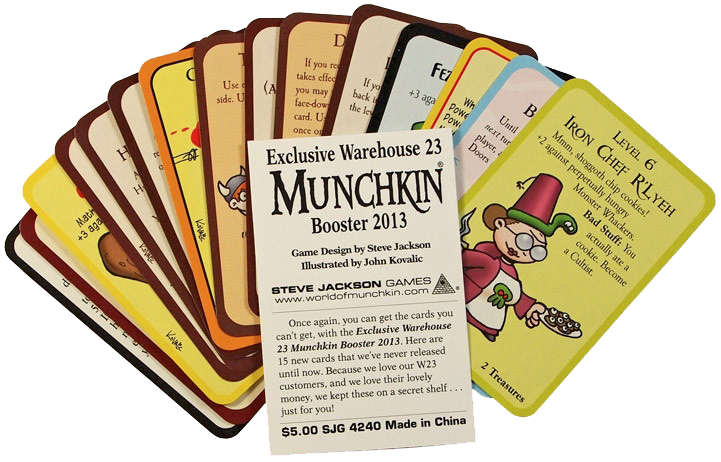 The Exclusive Warehouse 23 Munchkin Booster is pretty much described by the name: a fixed set of cards for the various Munchkin games sold exclusively through publisher Steve Jackson Games’ retail outlet, a.k.a. Warehouse 23. A booster has been released annually since 2010, and in most cases the cards included in the booster have not been available through any other means.