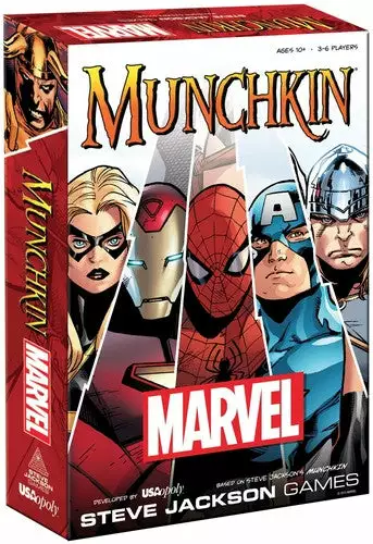Munchkin Marvel fuses the classic card game fun of monster-slaying and role-playing with the most iconic characters from the Marvel universe. Created under license from Steve Jackson Games and in conjunction with Marvel, Munchkin Marvel comes complete with new monsters (villains), allies (heroes), and custom S.H.I.E.L.D. Identification Cards.