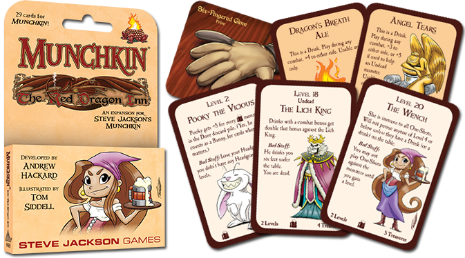 Munchkin: The Red Dragon Inn brings the characters from SlugFest Games’ The Red Dragon Inn series of games to the world of Munchkin. This mini-expansion of 29 cards features Monsters, Treasure, and new Drinks to consume — a variation on one-shots — as well as a special Munchkin-sized promo Prize card for The Red Dragon Inn.