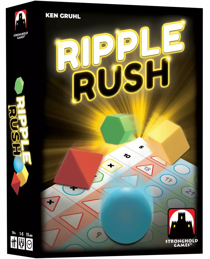 Ripple Rush is a flip-and-write game. You draw a card with a number and a color on it. You then write the number in the column of the same color on your sheet. If you draw a number that you cannot place, each other player can write the number on their sheet. When you complete a row, you get to place a bonus number. At the end, you score points for each color equal to the longest length of filled in boxes.