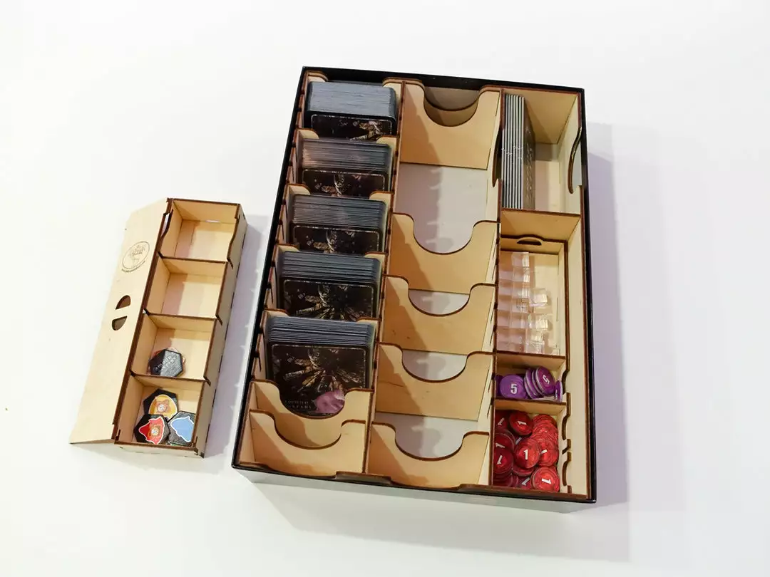 Our Among the Stars Organizer features two removable trays and plenty of card storage. It supports all existing expansions with plenty of room for growth. Like all of our organizers, it supports sleeved cards and comes with 8 adjustable dividers. Cards are stored at an angle to support even the largest card sleeves in the existing game box. Works great with Fantasy Flight FFS65 square card sleeves.