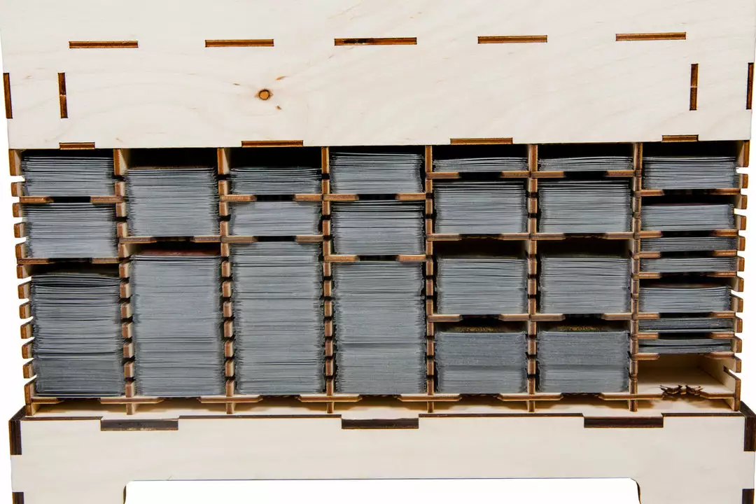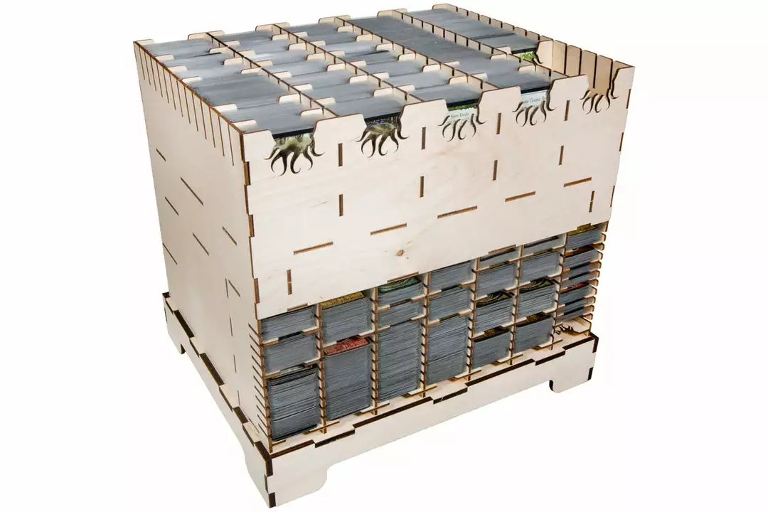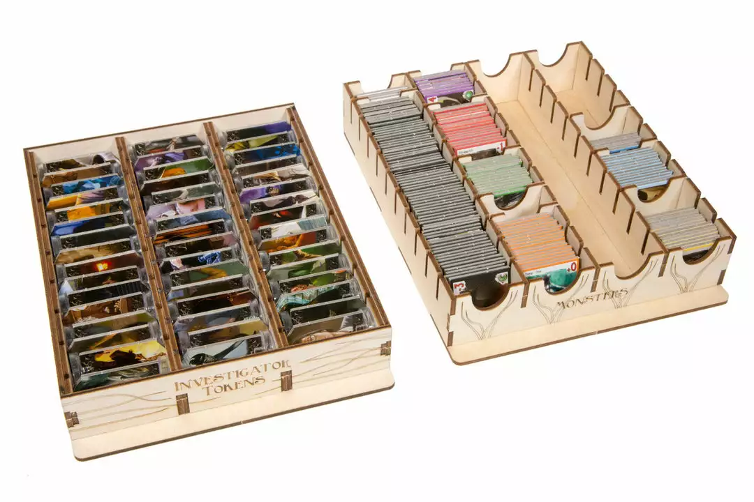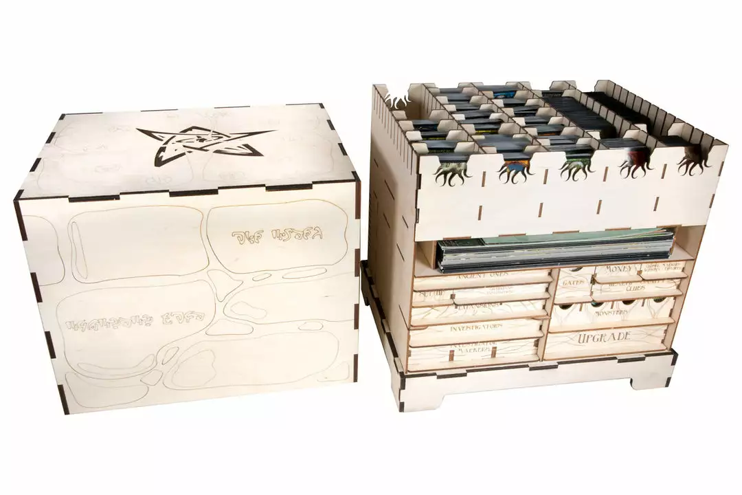 Get out on the streets of Arkham faster and wrap your investigations up with ease using our Arkham Altar crate compatible with Arkham Horror from Fantasy Flight Games. This crate is designed to store all of your tokens, markers, cards, and more within a premium wooden crate engraved with thematic art. Includes 23 large card section dividers and 20 small card section dividers.