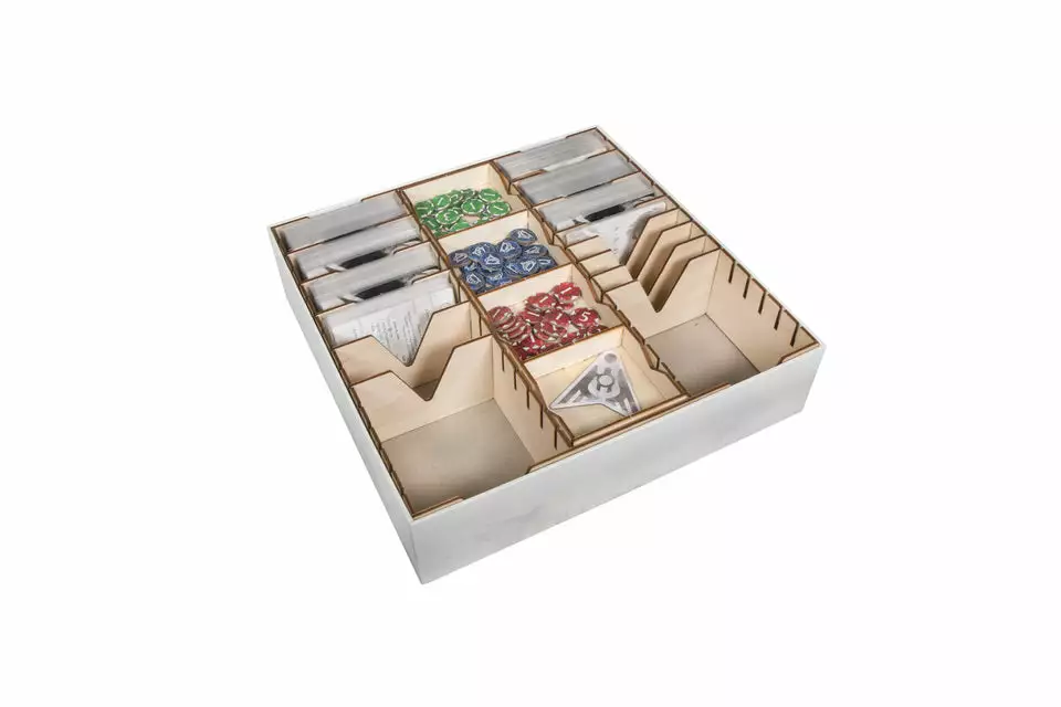 Your demi-gods are prepared to battle for civilization and godliness, but who will save your game shelf from sprawling expansions? Enter The Broken Token Ashes Organizer, compatible with Ashes: Rise of the Phoenixborn and its expansions. Three removable bits boxes feature 12 compartments, enough to accommodate and organize the tokens and dice from the base game and expansions listed below. Two card rows with 10 included adjustable dividers offer ample space for all your Phoenixborn, spell and unit cards, with room for more. Fit all this in the base game box and you’ll be reigning in chaos and ascending to power in no time!