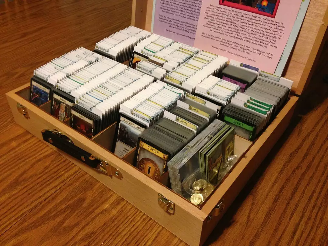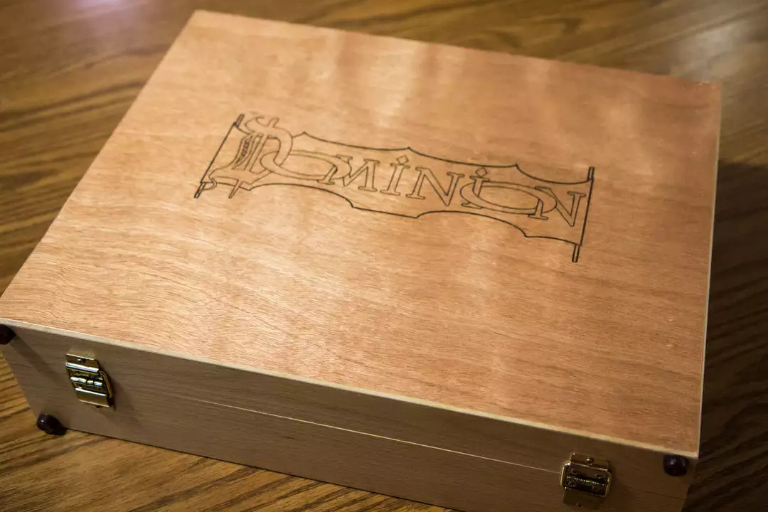 This custom wooden artist case is designed to store all eight Dominion expansions and features the Dominion logo prominantly engraved on the top of the box.