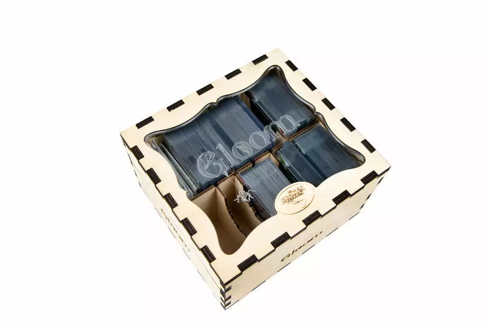 Is your life filled with too much cheer and sunshine? Bottle up that extra happiness with The Broken Token’s Gloom Tomb. This Craftsman Series storage solution features our first ever acrylic lid window to put all of your misery on display. The Gloom logo is engraved on each side, so there’s no denying a sad fate lies within. Two card rows with adjustable dividers will accommodate all the expansions listed below and premiums with room for future cards and other forms of tragedy. Includes 6 adjustable dividers, and supports sleeved and unsleeved cards. This death sentence is officially licensed by Atlas Games.