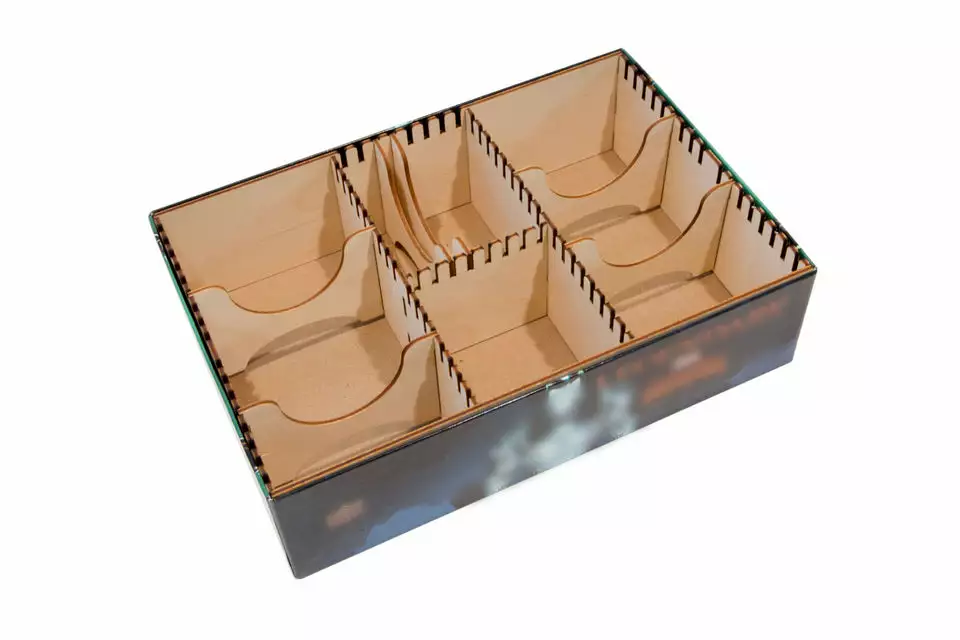 Our innovative pinwheel design allows for maximum card storage in the Marvel Legendary game box while saving enough room for the game board and manuals. Â All cards are stored horizontally and there’s enough room for sleeved cards from all current expansions. Â The cardboard dividers that come with Legendary fit nicely in the box and we provide 6 wooden dividers to further organize your cards.