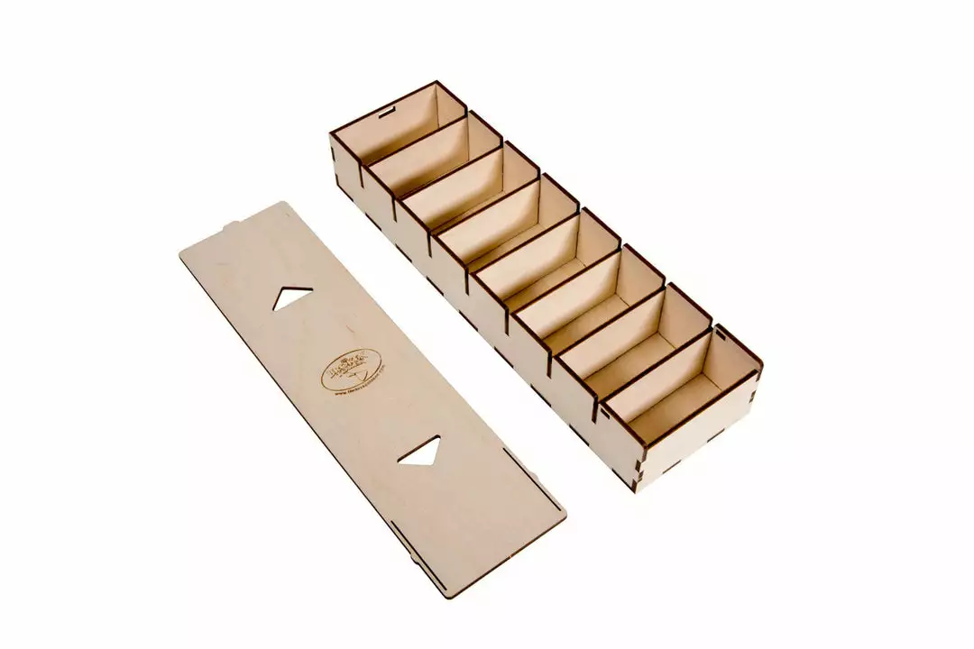 This bits box was designed to occupy the center row of our Sleeved Card Game Organizer (ORG006). Perfect for storing your game tokens and other small items.