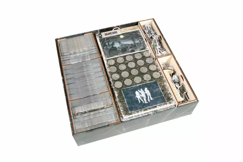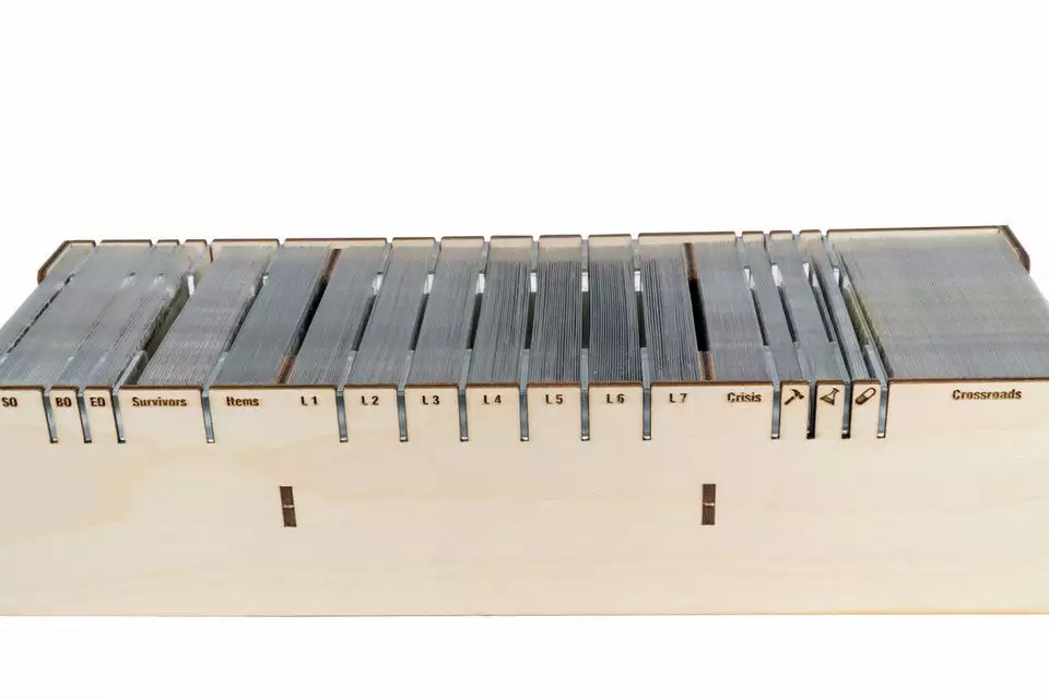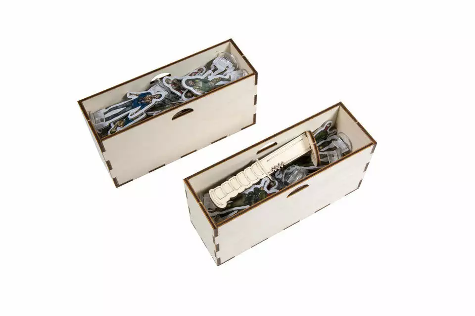 You’ve survived the initial winter, but now darkness has fallen and dawn is nowhere in sight! Here to help you survive is our Long Winter Organizer, specifically designed to bring order to your Dead of Winter®: The Long Night box. Cards are neatly organized into designated sections with removable dividers, and supports sleeves. Your colony characters are safely separated from zombies, experiments and bandits with four removable standee trays. Two removable token trays contain your dice, tokens and extra stands. And start the night in style with our exclusive wooden “start player” knife token.