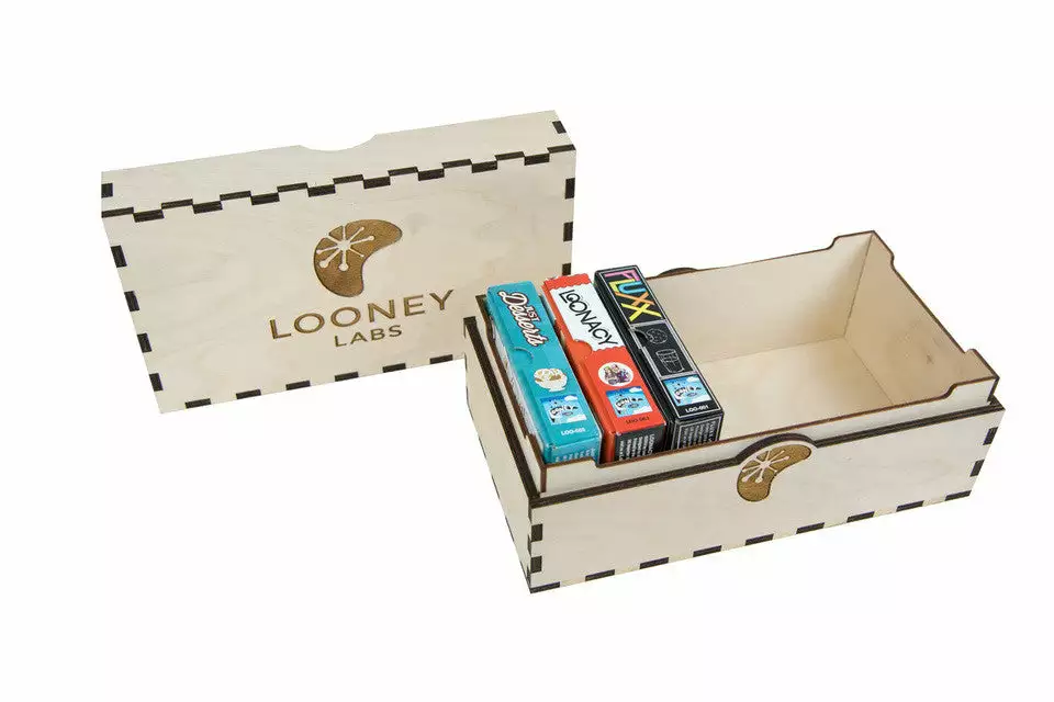 Assemble your own high quality game box to hold your Looney Labs games. Made from 1/4″ and 1/8″ Baltic Birch, this precision cut kit is easy to assemble and makes a beautiful addition to your gaming collection. Accommodates 9 Looney Labs game boxes such as Fluxx, Just Desserts, etc.