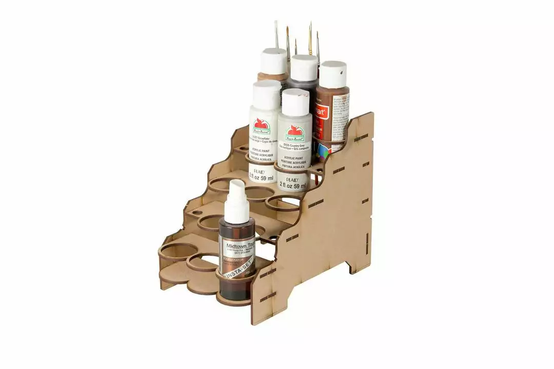 These MDF racks hold your paint pots, bottles and brushes in a tiered layout for easy organization and access when customizing your game pieces. Multiple racks can be combined into a larger system using the included clips!