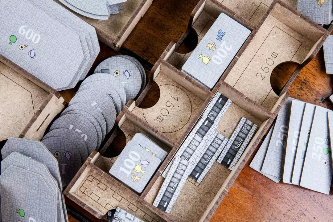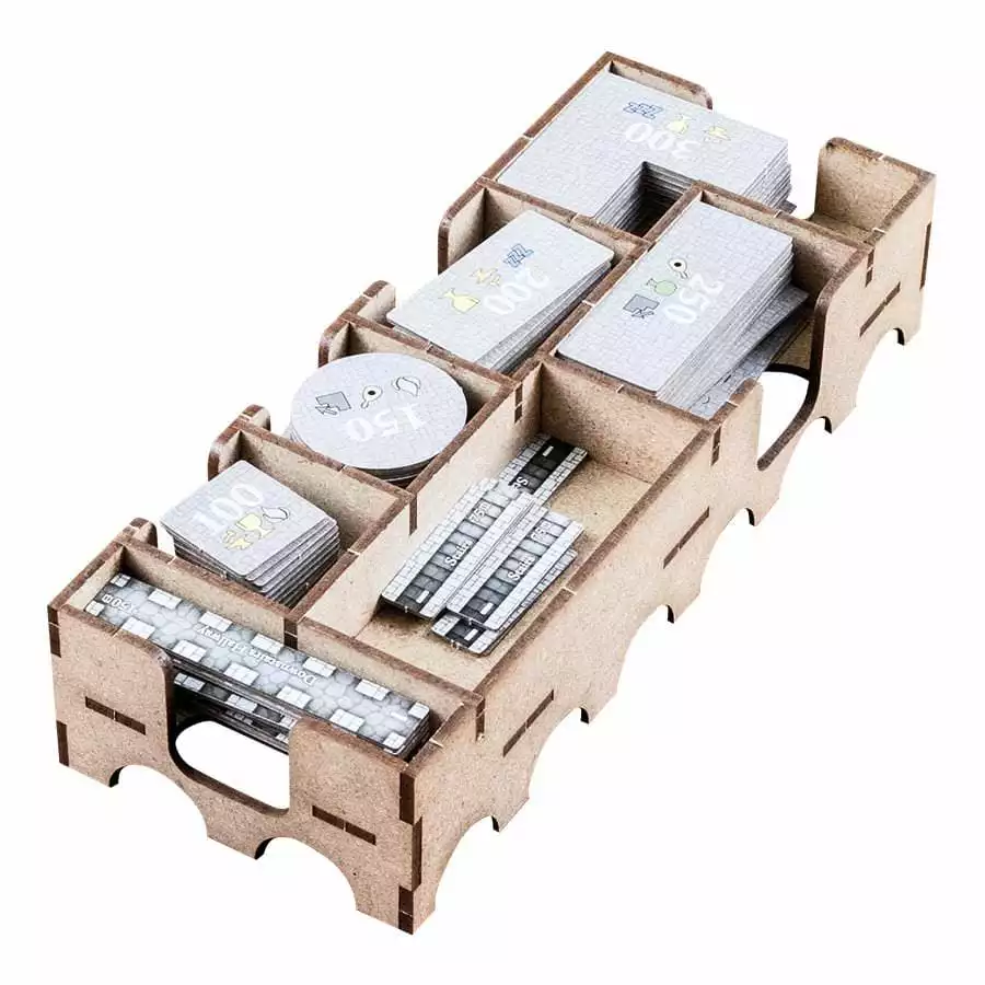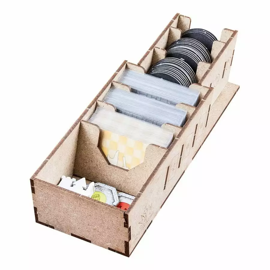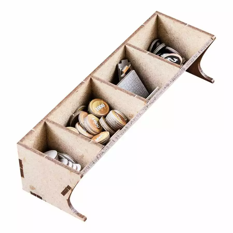 • 1x easy pick box with spaces for swans (expansion) tokens, 1000 value coins, 5000 value coins and secret passages (expansion).