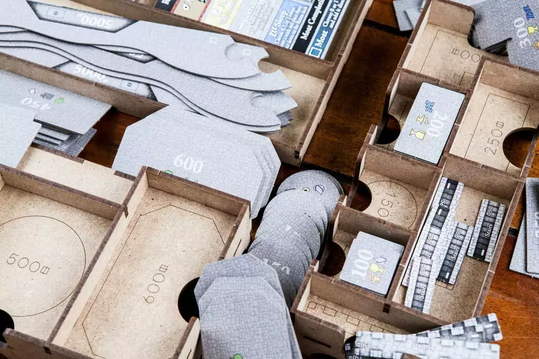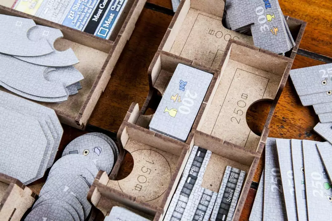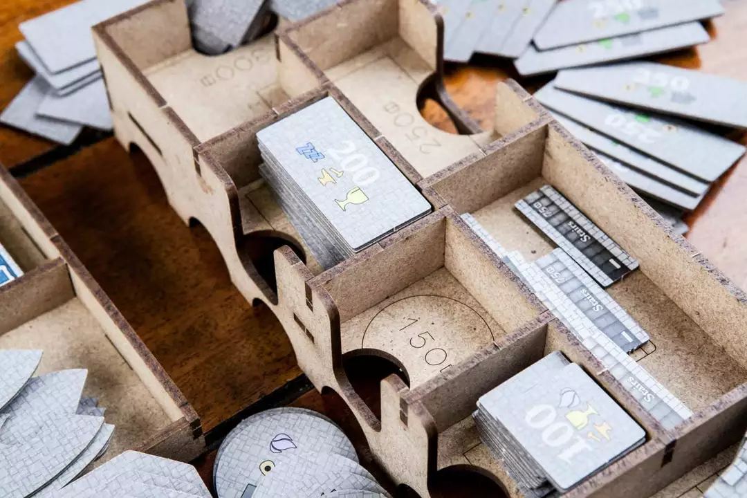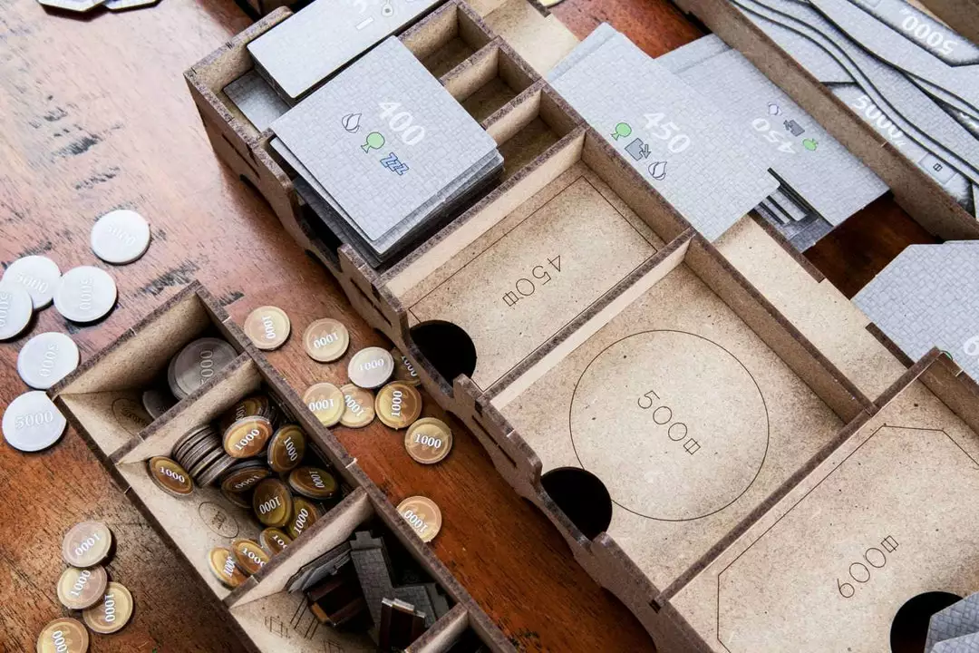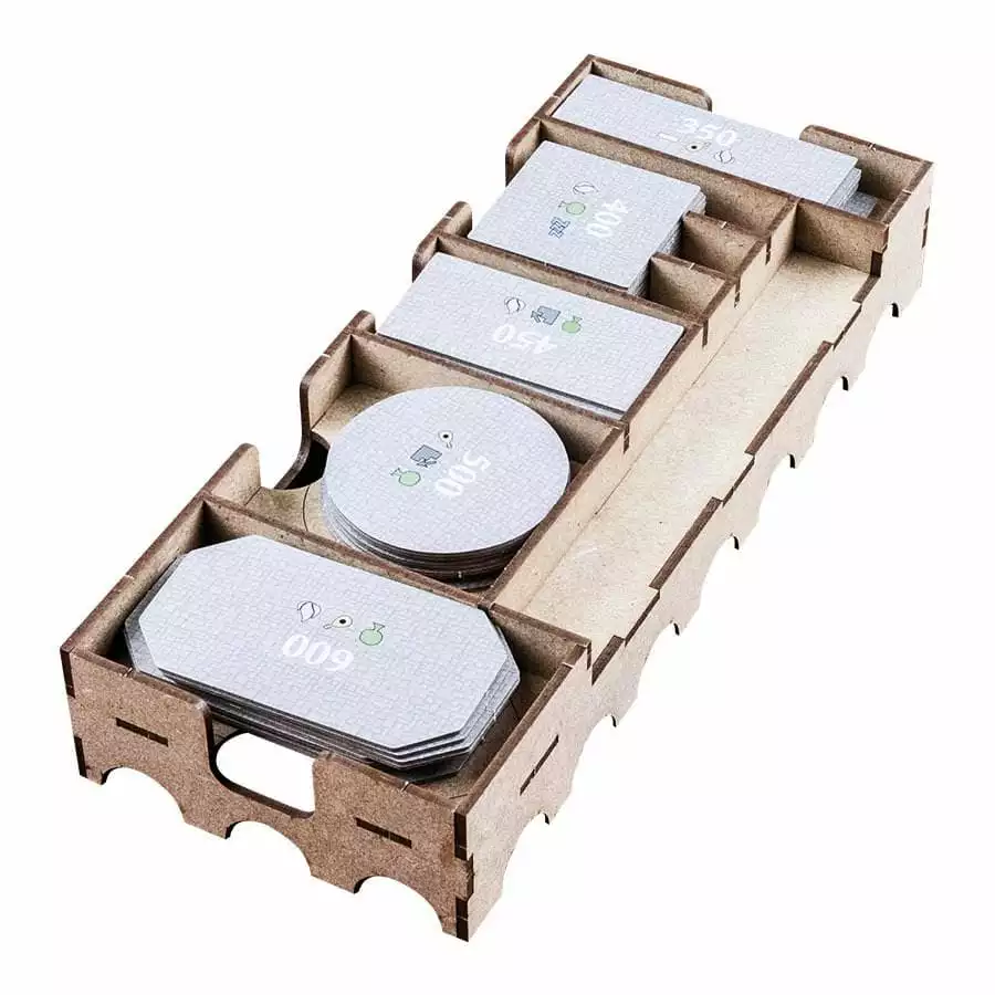 • 1x easy pick box with spaces for swans (expansion) tokens, 1000 value coins, 5000 value coins and secret passages (expansion).