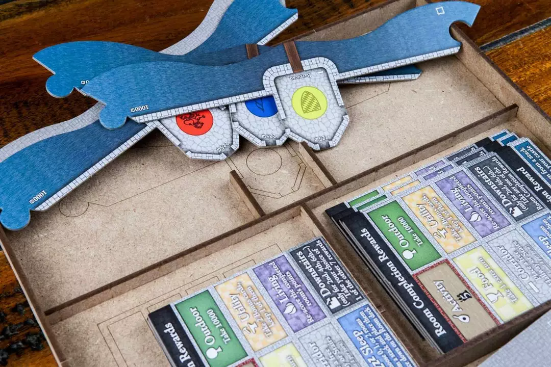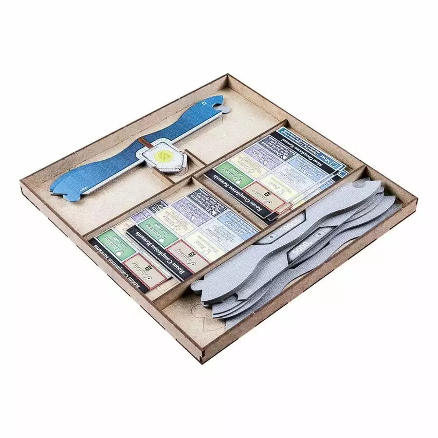 • 1x cardbox with spaces for room cards, bonuses and favor tokens;