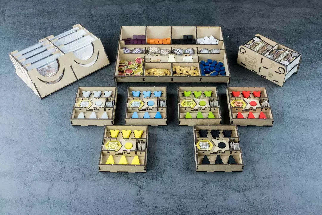 • 1x resource tray with slots for each type of resources and 5x tokens. Central slot for neutral meeples.