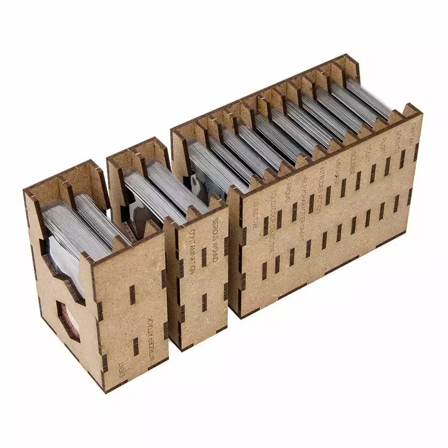 Designed to fit into the game box. Designed for both sleeved and unsleeved cards.