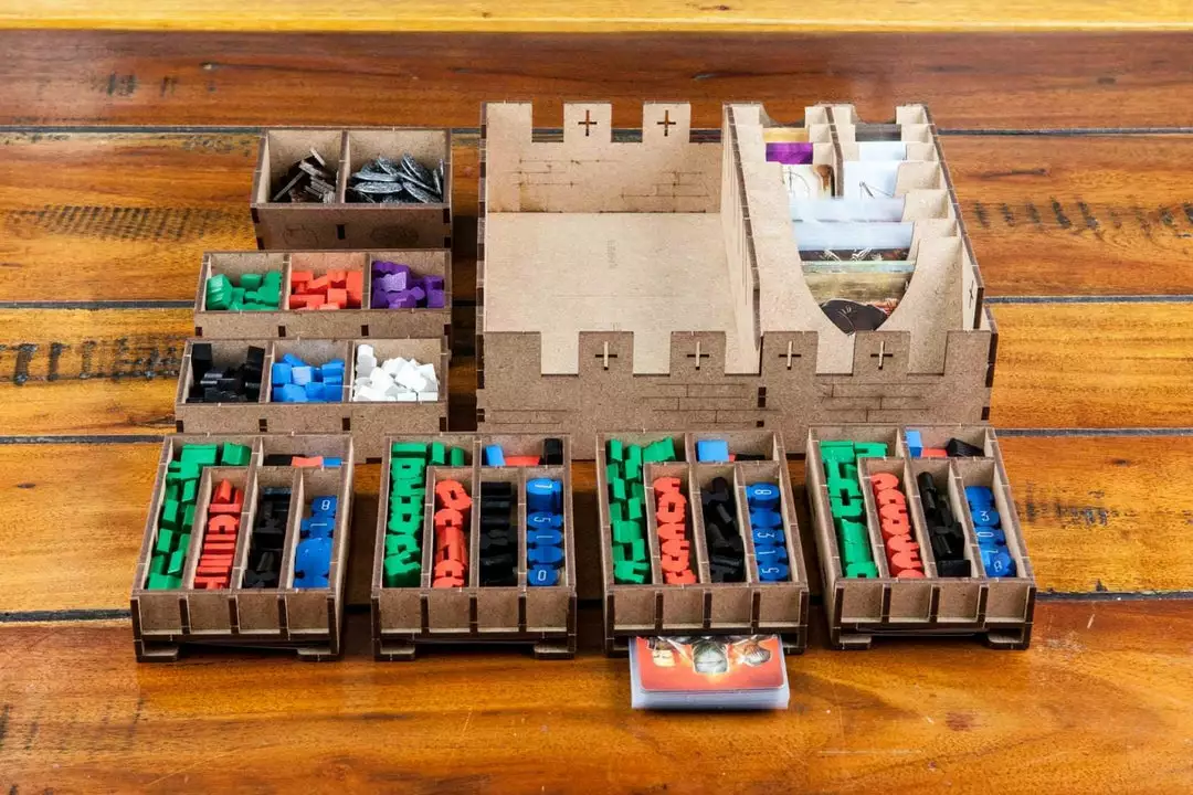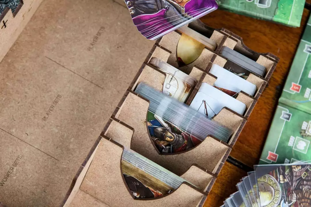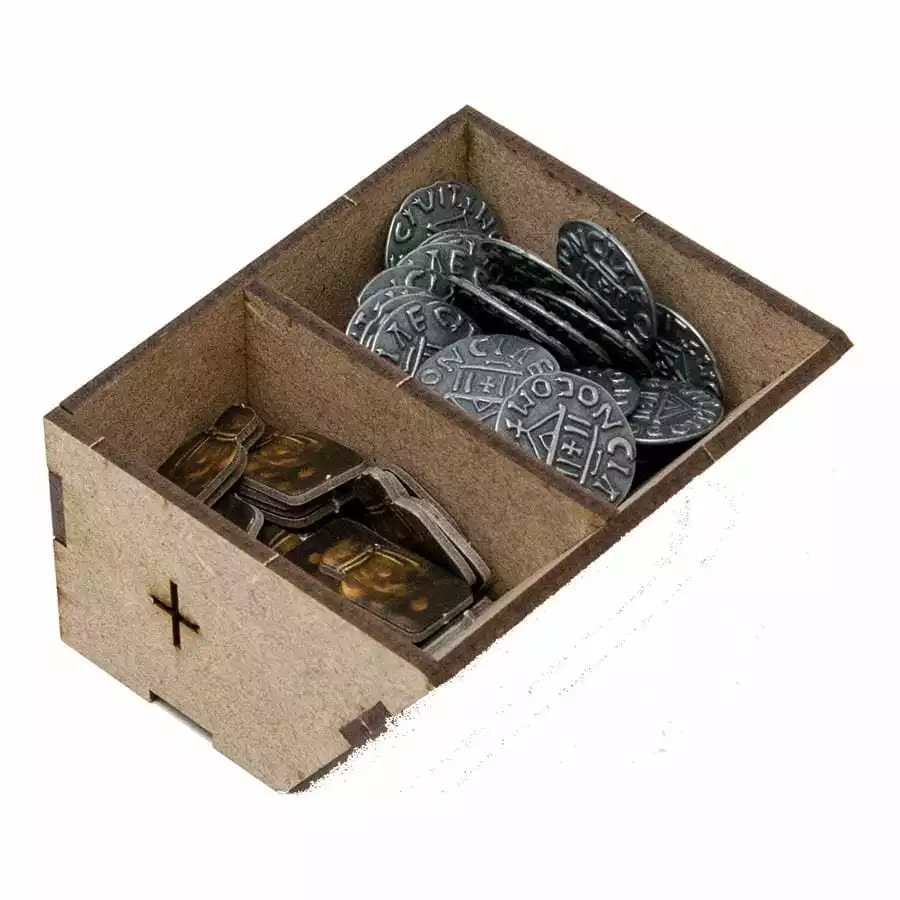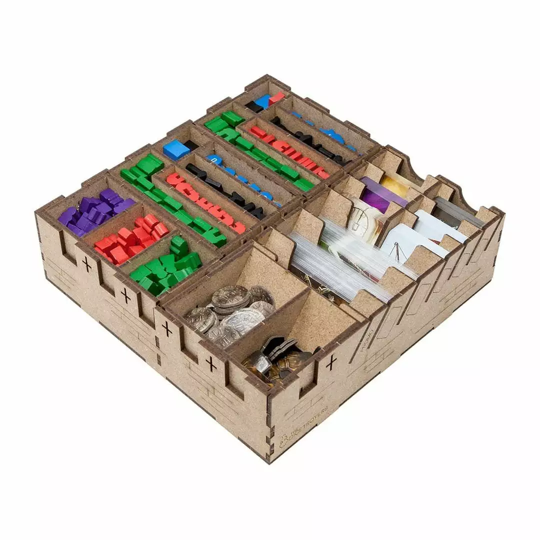 Organizer compatible with Paladins of the West Kingdom. Includes slots for kickstarter exclusives (promo cards and metal coins).