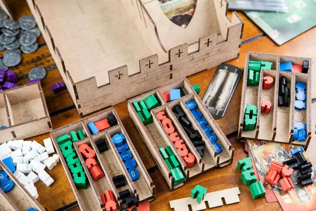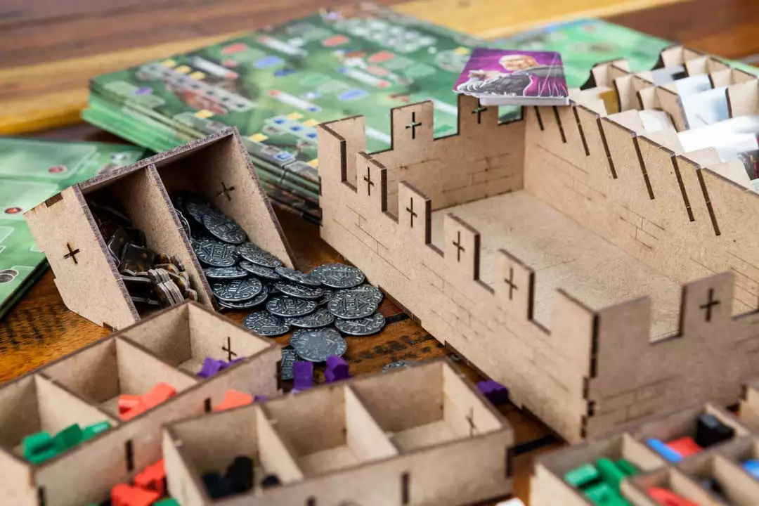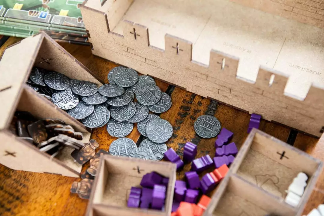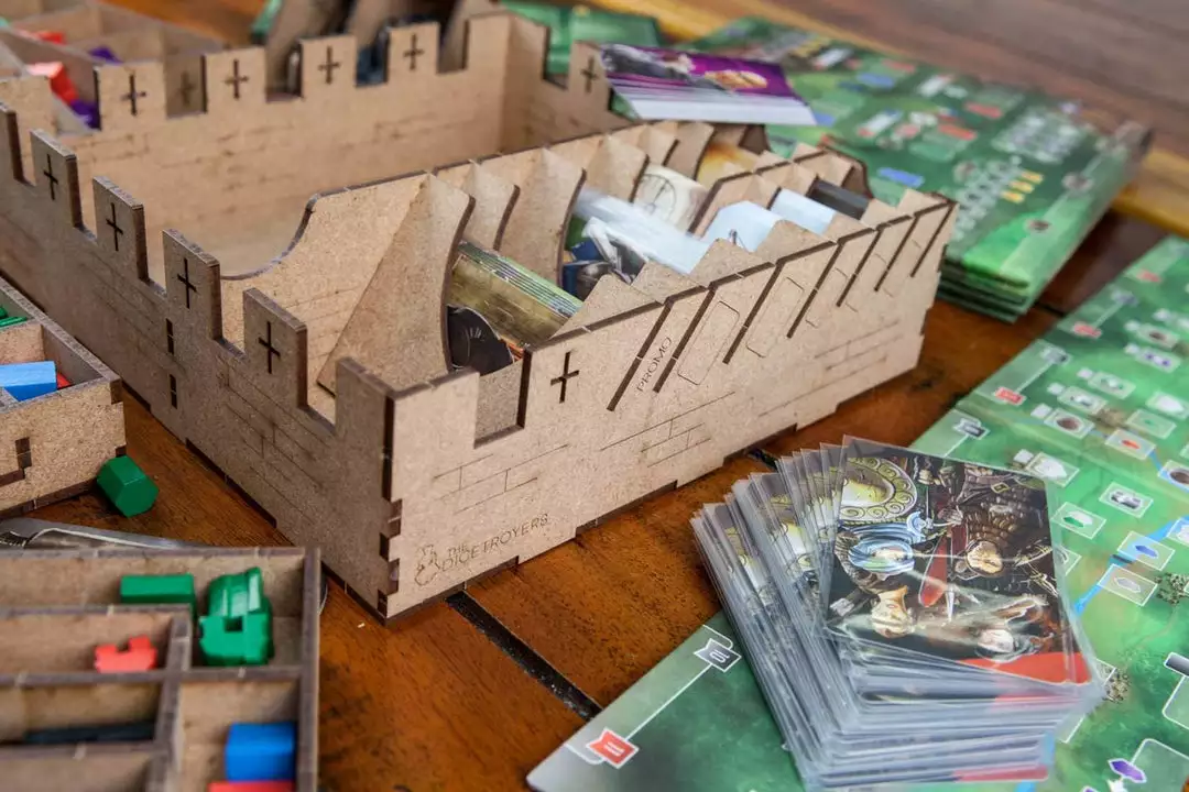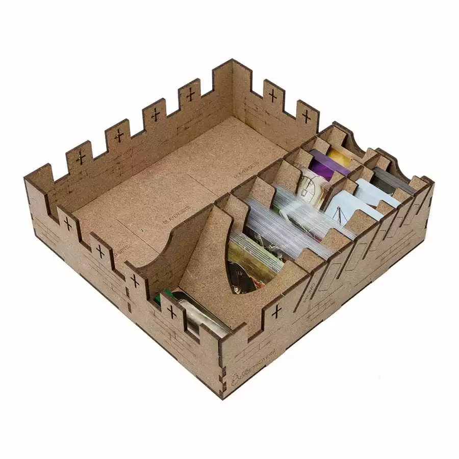 Organizer compatible with Paladins of the West Kingdom. Includes slots for kickstarter exclusives (promo cards and metal coins).