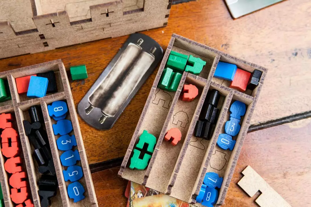 • 4x player set boxes, with separate slots for each piece type and shutter closure for immediate extraction. Bottom slot for Paladin cards;