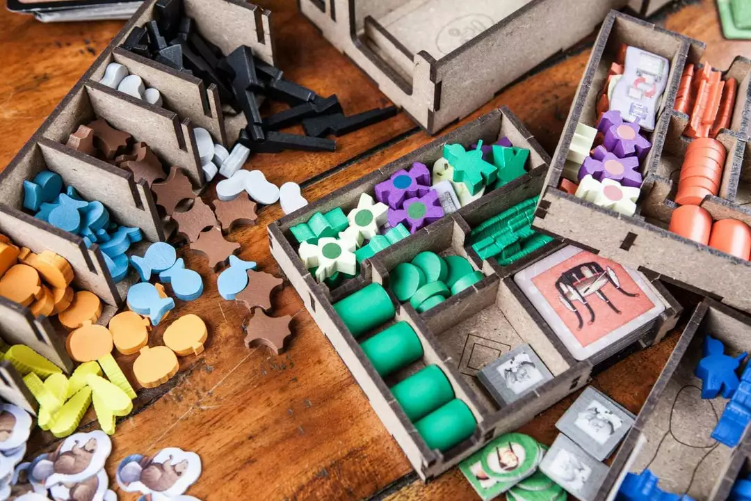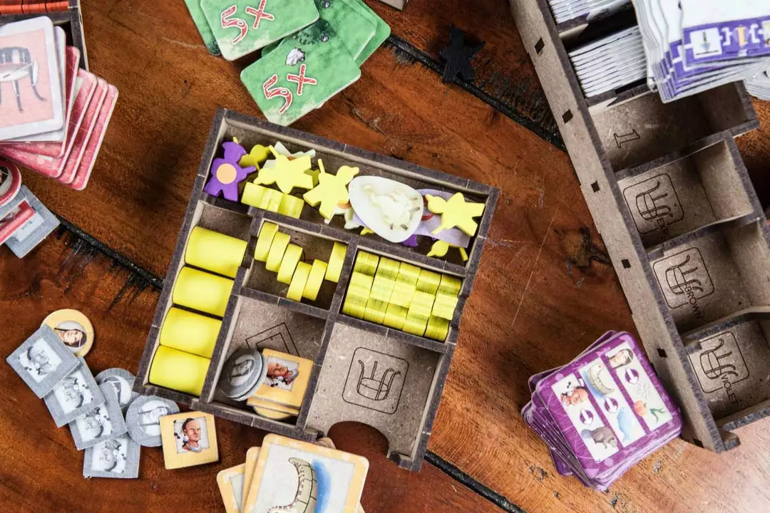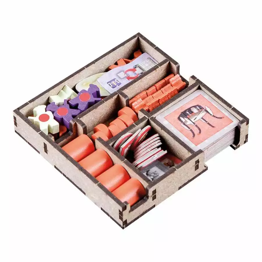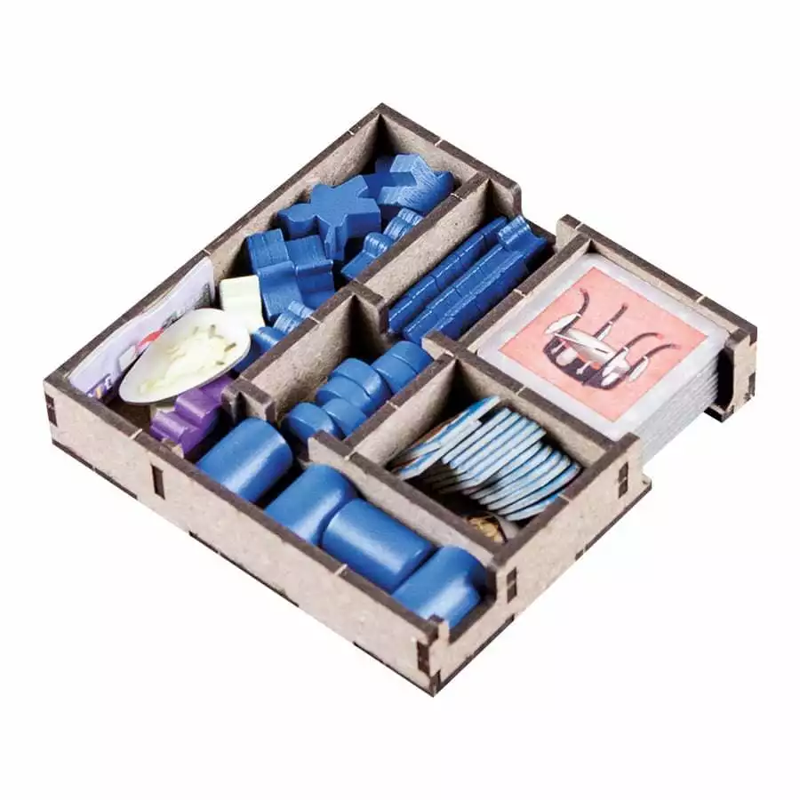 • 1x box with spaces for action and progress tiles, with separate number/color hostings and space for core game pieces, expansion and kickstarter edition tiles;